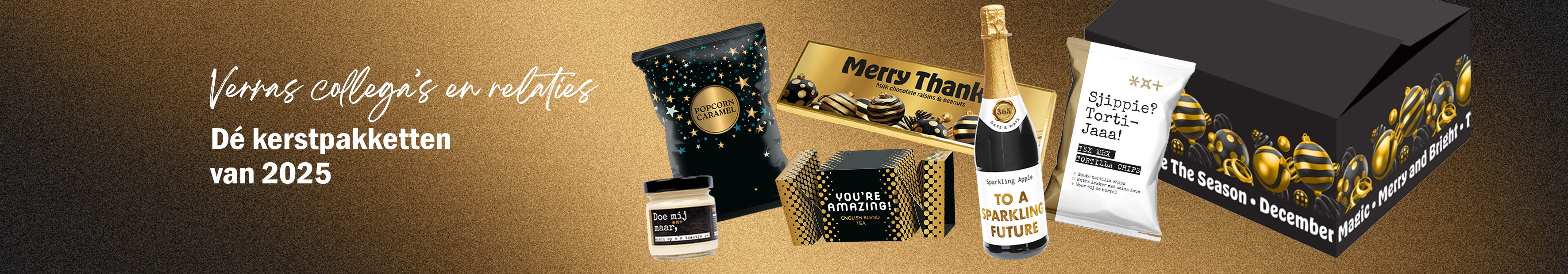 Of je nu iets zoekt voor medewerkers, klanten of relaties: je vindt hier altijd een stijl die past. Van luxe tot vrolijk, klassiek tot verrassend anders - altijd royaal gevuld met lekkernijen en originele cadeaus. Wil je een kerstpakket zelf samenstellen? Dat kan al vanaf 200 stuks, helemaal in jouw huisstijl en afgestemd op je wensen.
